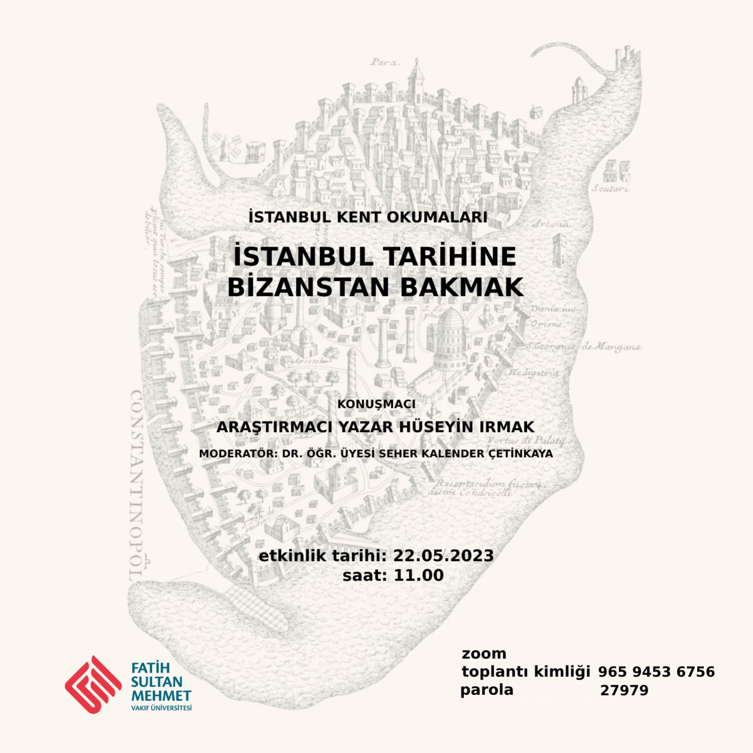 Dr. Öğr. Üyesi Seher Kalender Çetinkaya tarafından yürütülen İstanbul Kent Okumaları dersi kapsamında düzenlenecek olan seminer serisinin ilki Araştırmacı Yazar Hüseyin Irmak'ın katılımıyla gerçekleştirilecektir. Seminerde Hüseyin Irmak dünyanın kadim kentlerinden biri olan İstanbul’un köklerine kısa bir yolculuk yapacak ve iç içe yaşadığımız bazı eserler üzerinden farkındalık oluşturmaya çalışacaktır.