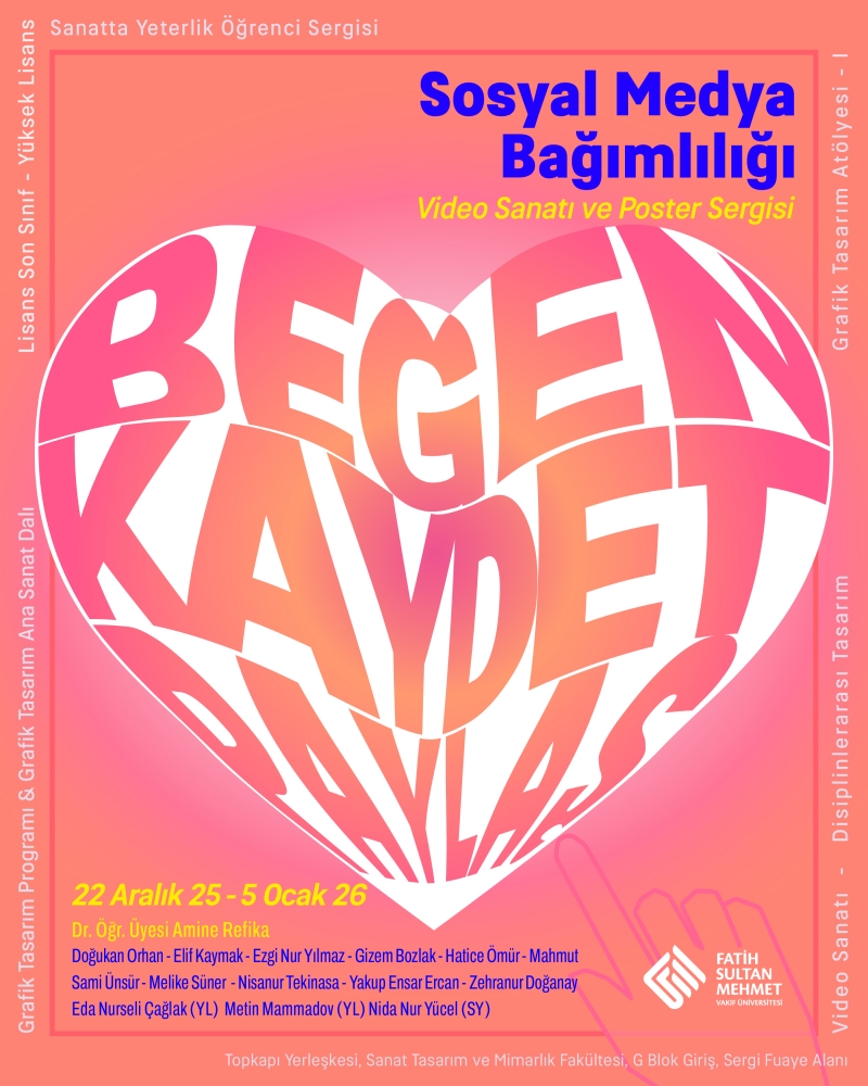 Bu derste öğrenciler teknik becerilerin yanında kavramsal yaklaşımları nasıl tasarıma dönüştürebileceklerini tecrübe ettiler. Ve Sosyal Medya Bağımlılığını farklı bir üslupla ele alan posterlerden vi video sanatı çalışmalrından meydana gelen keyifli ve eleştirel tasarımlar sergide yerini aldı. Video sanatı işlerine posterlerin yanındaki QR kod okutularak ulaşılabilir. Sergimiz herkesin ziyaretine açıktır.
