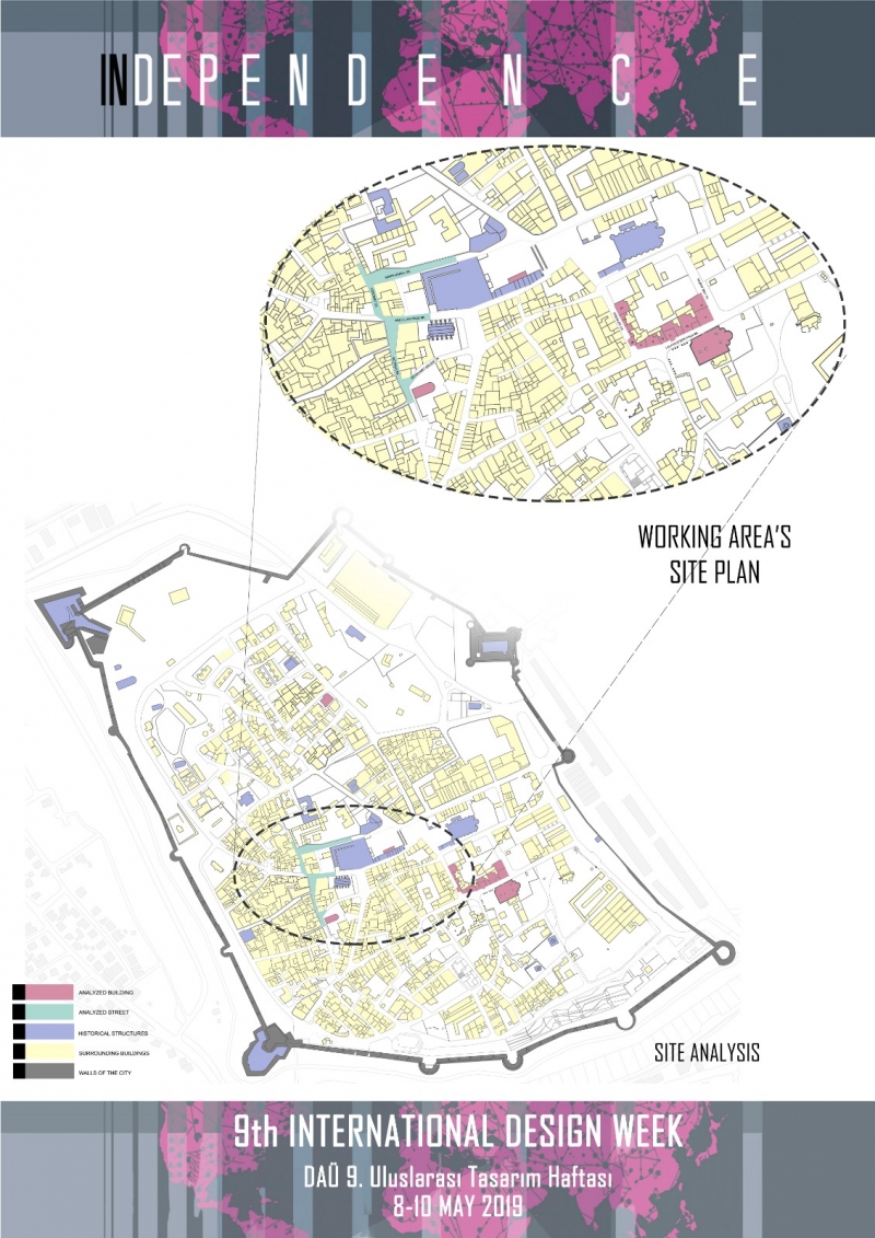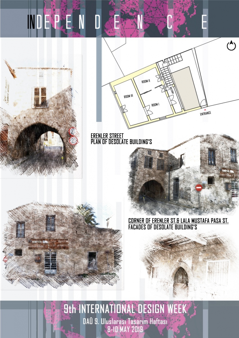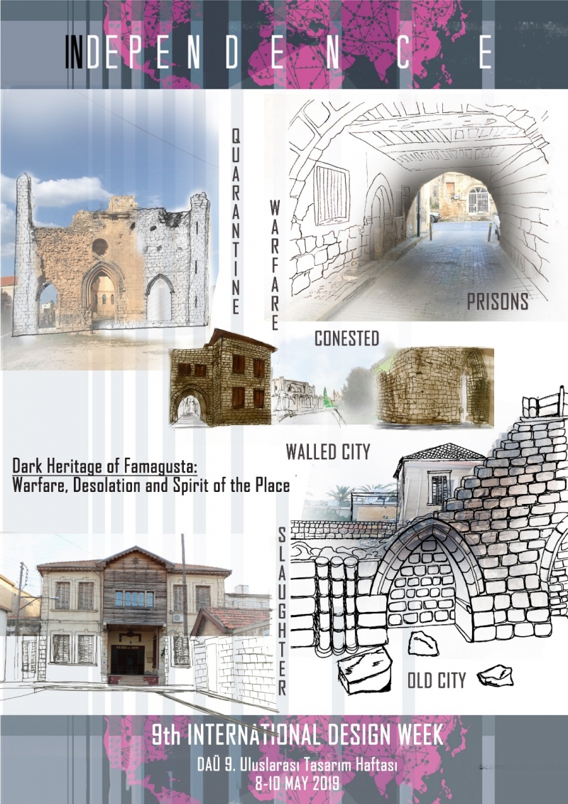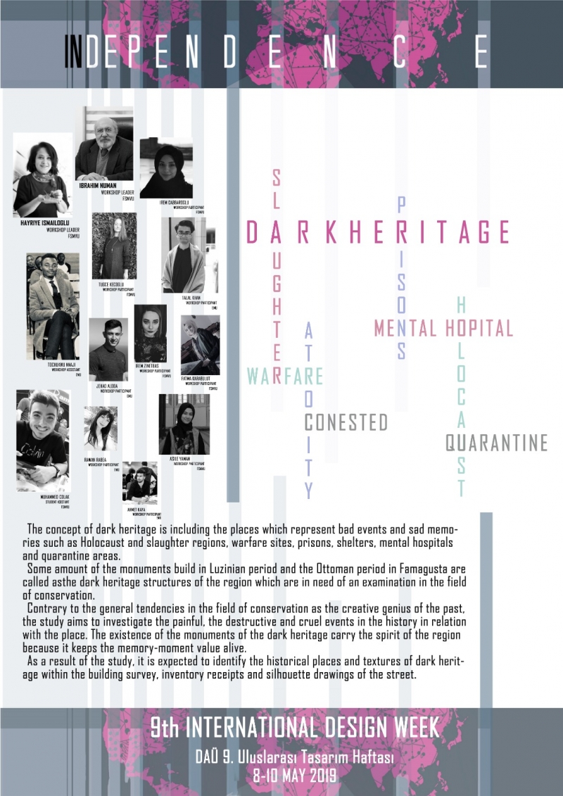 8-10 Mayıs 2019 tarihleri arasında Doğu Akdeniz Üniversitesi Mimarlık Fakültesi’nin ‘In/Dependence’ teması ile düzenlediği 9. Uluslararası Tasarım Haftası’na Arş. Gör. Hayriye İSMAİLOĞLU yürütücülüğünü üstlendiği ‘Gazimağusa’nın Tedirgin Edici Mirası: Savaş, Terk Edilmişlik ve Yerin Ruhu’ konulu çalıştay, FSMVÜ Mimarlık Bölümü öğrencilerinden Tuğçe Keçoğlu, Muhammed Çolak, İrem Cabbaroğlu ve Restorasyon Programı Lisansüstü öğrencilerinden Fatma Karabulut, Asile Yaman ile Doğu Akdeniz Üniversitesi Mimarlık Bölümü’nden 7 öğrenci olmak üzere toplam 12 öğrencinin katılımı ile gerçekleştirilmiştir.