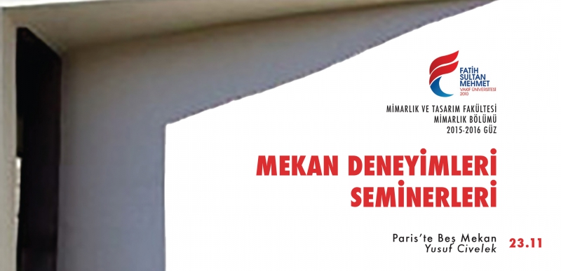 Mekan Deneyimleri Seminerleri 23 Kasım 2015 Pazartesi saat 11.00'da FSMVÜ Haliç Yerleşkesi, A-103 dersliğinde Yusuf Civelek'in "Paris'te Beş Mekan" sunumuyla devam edecektir.