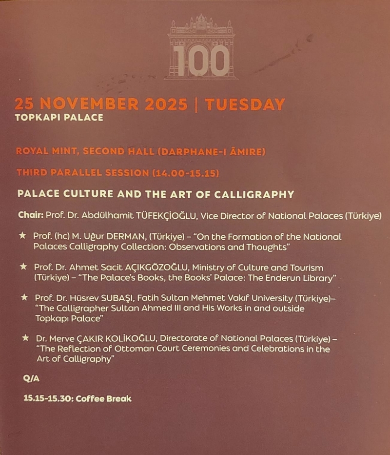 Milli Saraylar Başkanlığı'nca 24-26 Kasım 2025 günlerinde düzenlenen "Milli Sarayların Yüzyılı" adlı Uluslararası Sempozyum, dünyanın farklı ülkelerinden müzeci ve akademisyenleri bir araya getirdi. Topkapı, Dolmabahçe ve Yıldız Saraylarında gerçekleştirilen oturumlardan birinde konuşan dekan Prof. Dr. M. Hüsrev Subaşı "Sultan III. Ahmed'in hattatlığını ele aldı, Topkapı Sarayı ve dışındaki eserlerini seçilmiş görseller eşliğinde gündeme getirdi. Yerli yabancı çok sayıda araştırmacı tarafından izlenen toplantılar dizisi dünkü akşam yemeği ile son buldu.