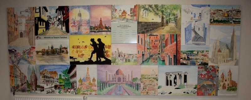 Mimarlık ve İç Mimarlık birinci sınıf öğrencilerinin “Suluboya Teknikleri” dersinin final ödevlerinden derlenen çalışmaları Topkapı Yerleşkesi kütüphanesinin iç mekânına pano olarak tasarlandı.